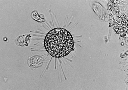 繊毛虫を捕食するポドフィリア-3 柄から離れたPodophrya(ポドフィリア)が、吸管で二つの小型の繊毛虫を捕えて体液(細胞質)を吸収している画像。 複数捕えた画像は珍しい。 故堺氏収蔵 |