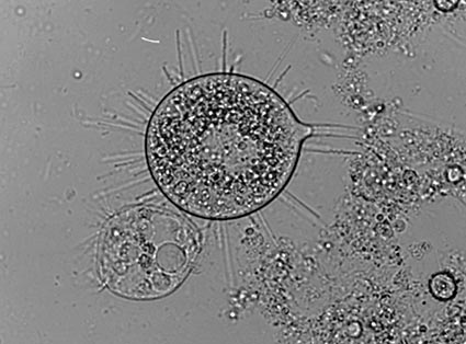 繊毛虫を捕食するポドフィリア-4. Podophrya(ポドフィリア)が、吸管で小型の繊毛虫(Cinetochilum:キネトキルム?、Colpidium:コルピディウム?)を捕えて体液(細胞質)を吸収している画像 故堺氏収蔵 |